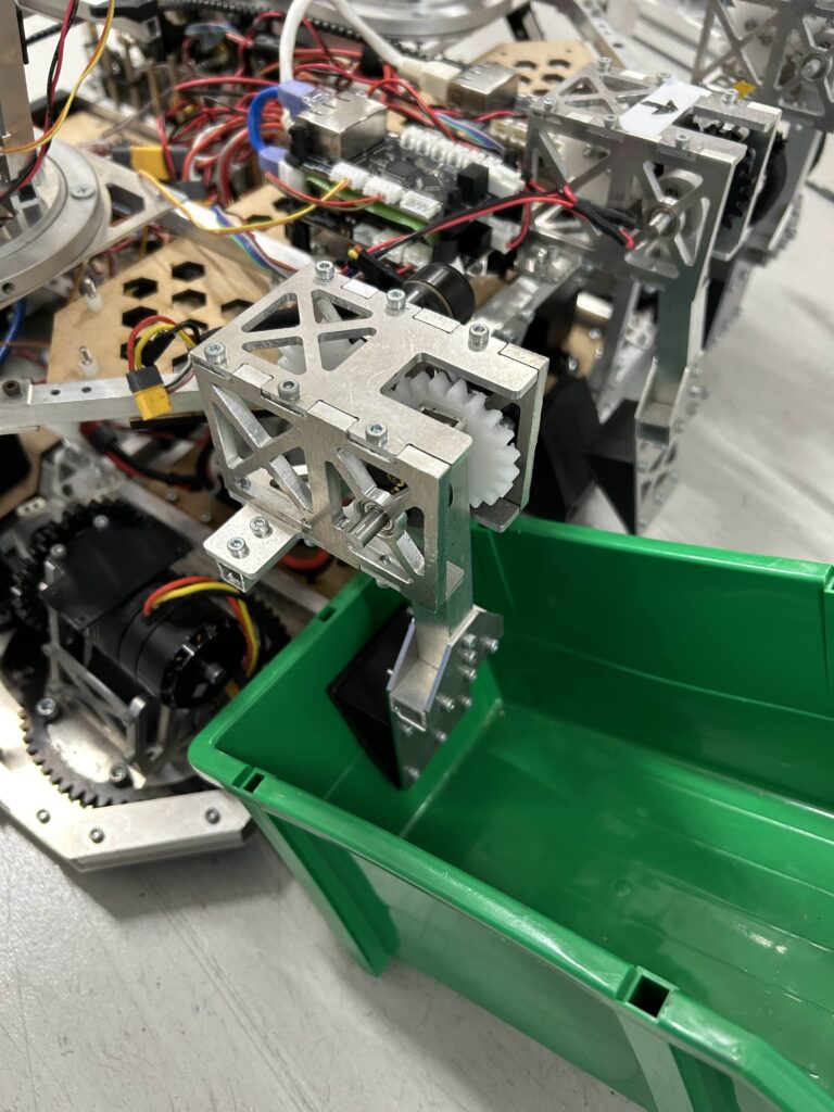 こちらの機構は先端に斜面形状の部品を取り付けた角材を回転させて、ボックスの内面を押さえつけることで回収します。斜面形状の部品によりボックスを運ぶときに地面との接触を減らすという意図があります。