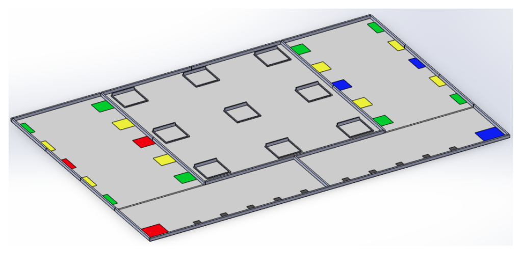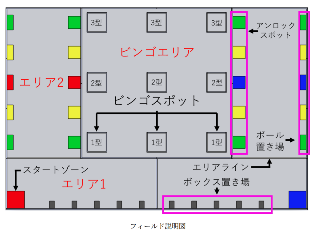 「競技の概要は以下の通りです。最初に、ボックス置き場から色付きのボックスを回収し、それらを同じ色のボックス用スポット(アンロックスポット)に配置します。アンロックスポットは合計5箇所あります。ボックスを設置したあと、ロボットはボールを回収し、9箇所のボール用スポット(ビンゴスポット)に投げ入れます。相手より多くの ボールをビンゴスポットに入れて、ビンゴスポットを占領し、ビンゴを作成して行きます。」