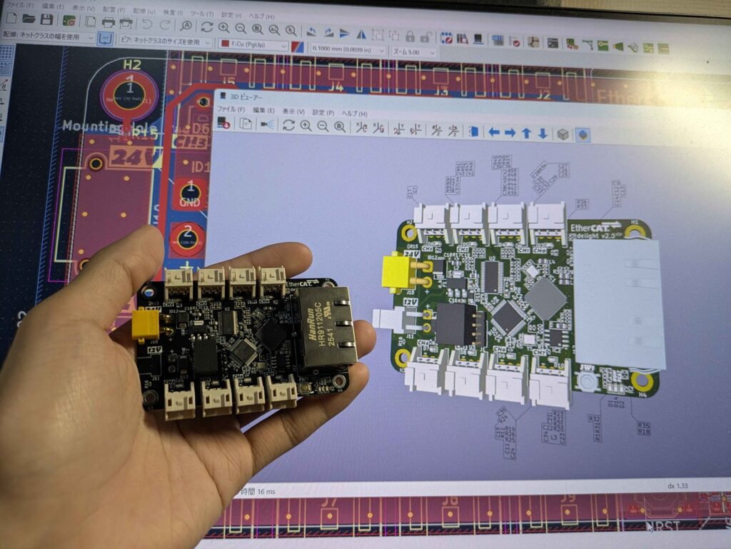 高専ロボコンと比較して驚いたのは,その小ささ(2層に詰める部品密度)ももちろんそうですが,通信にEtherCATを使っているというところです.